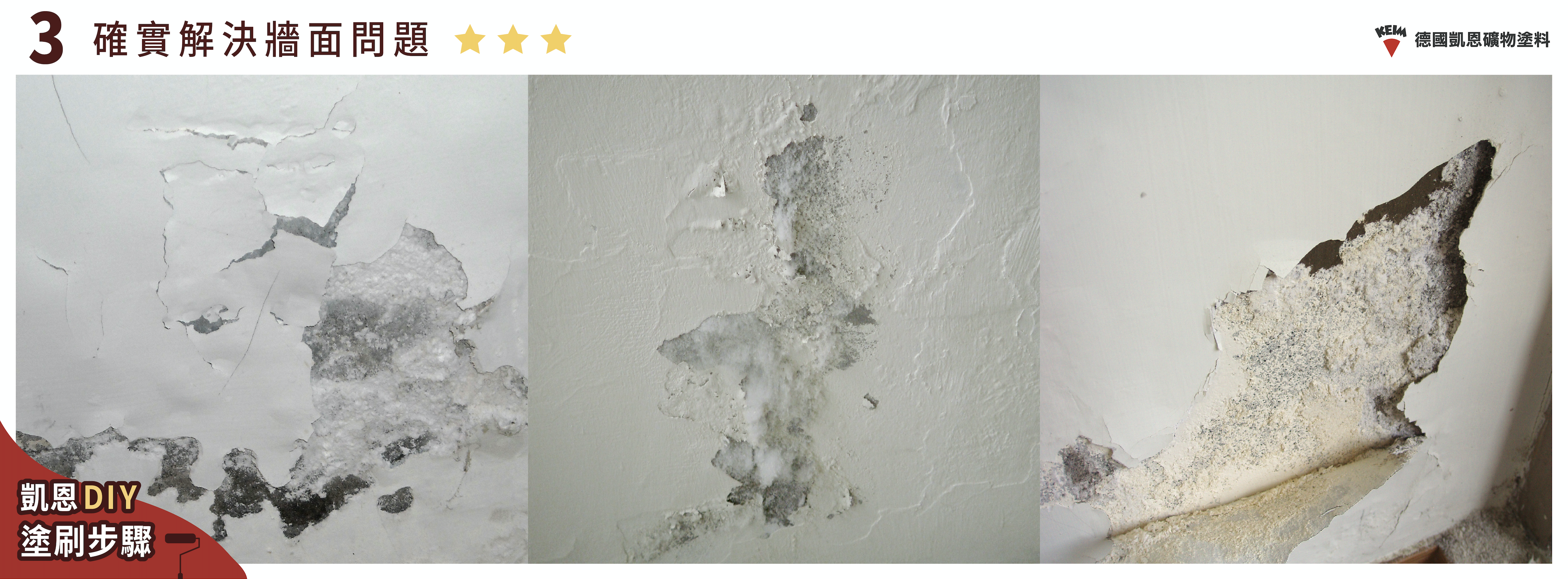 3. 牆面有剝落、發霉、壁癌等問題時,須先徹底解決後再上塗料。