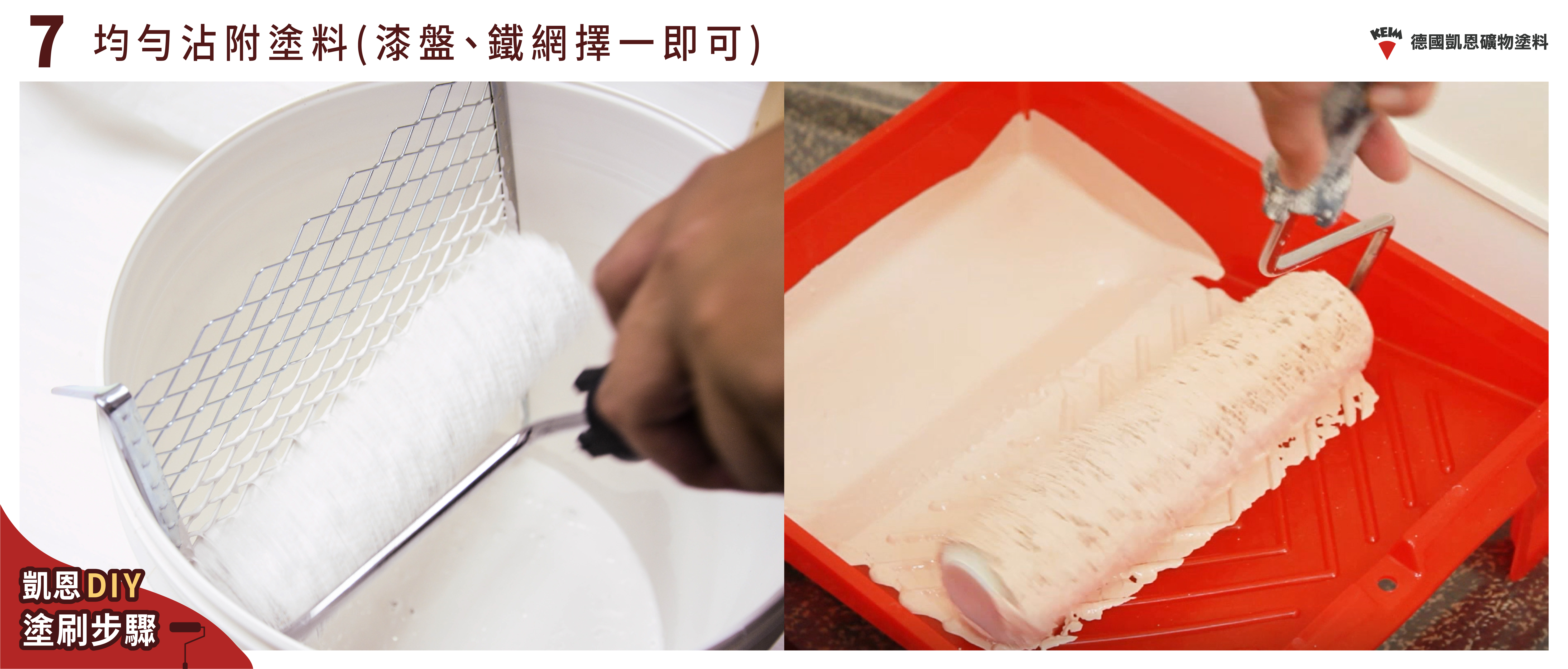 7. 在將沾了塗料的滾輪在漆盤或鐵網上來回滾動,讓滾輪均勻吸收塗料,並將多餘的塗料刮除,塗刷時才不會厚薄不均。