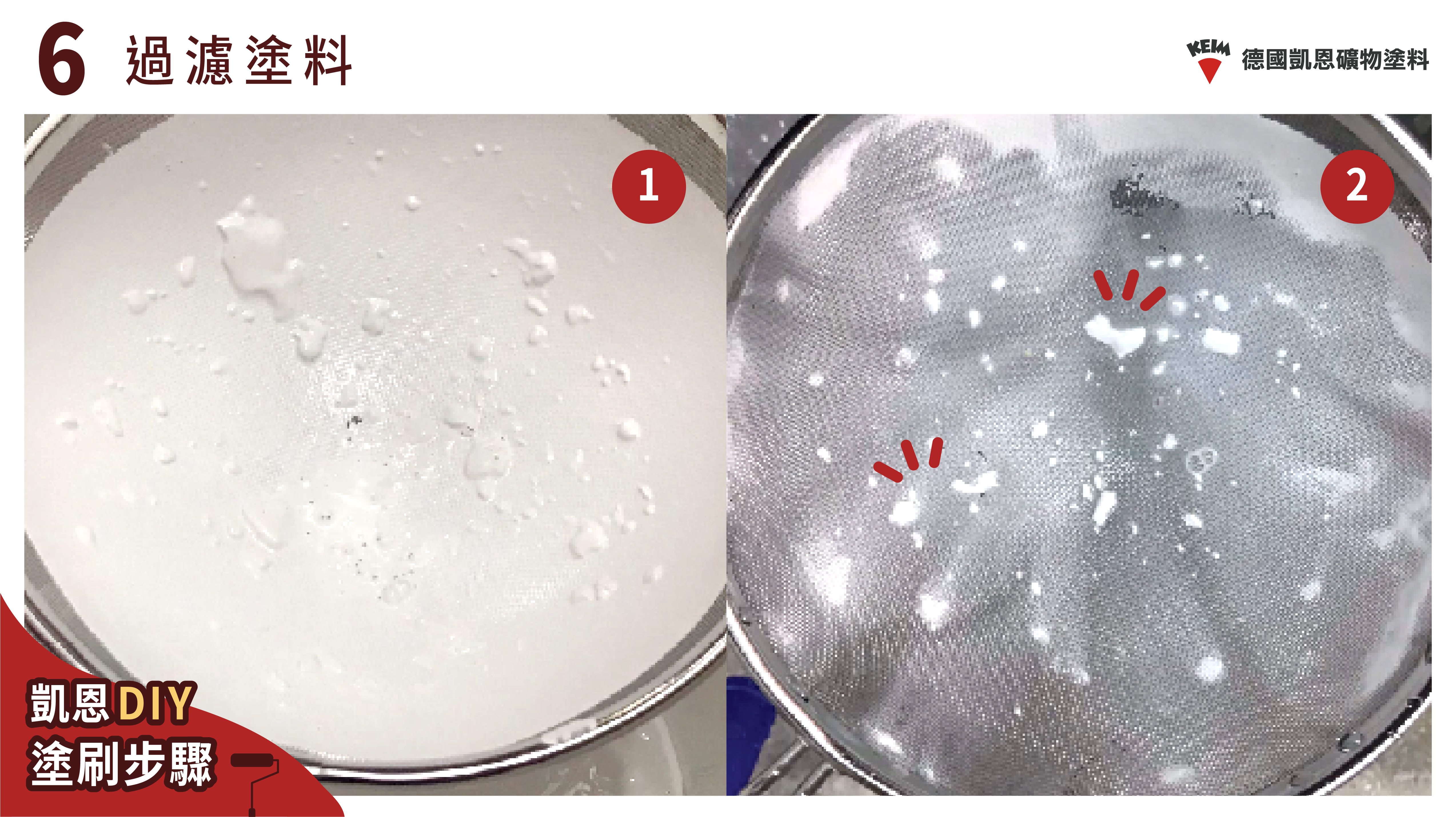 6. 由於天然礦物色粉容易沈澱結塊,塗佈時會降低成品美觀,使用噴槍時也可能堵住噴嘴出口,因此施作前需先進行過濾。過濾時需使用30mesh的濾網。