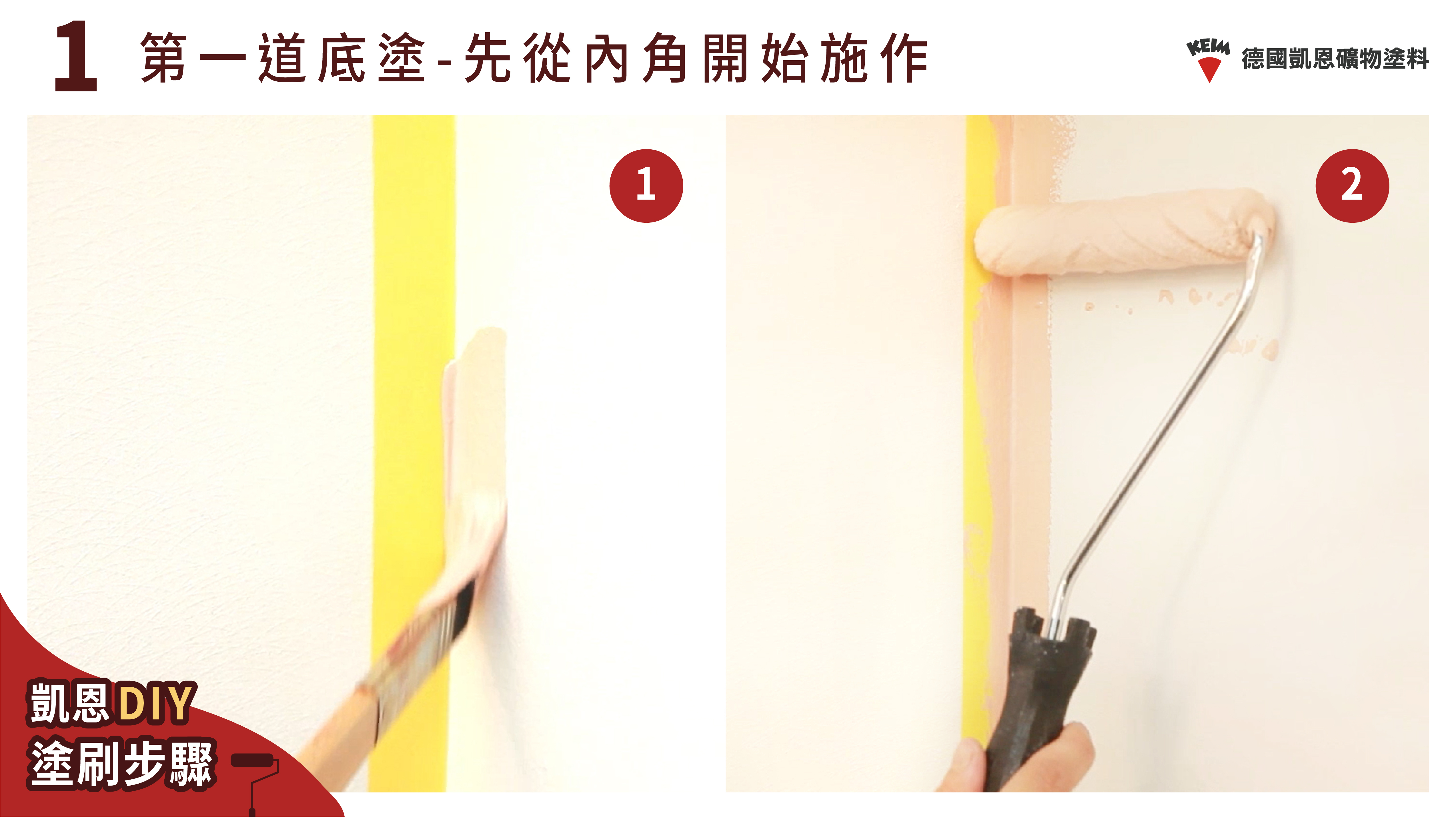 1. 可先使用刷子塗刷牆面的邊緣與角落,再使用滾輪進行大面積塗刷,分區施作也較能避免留下乾濕接縫。