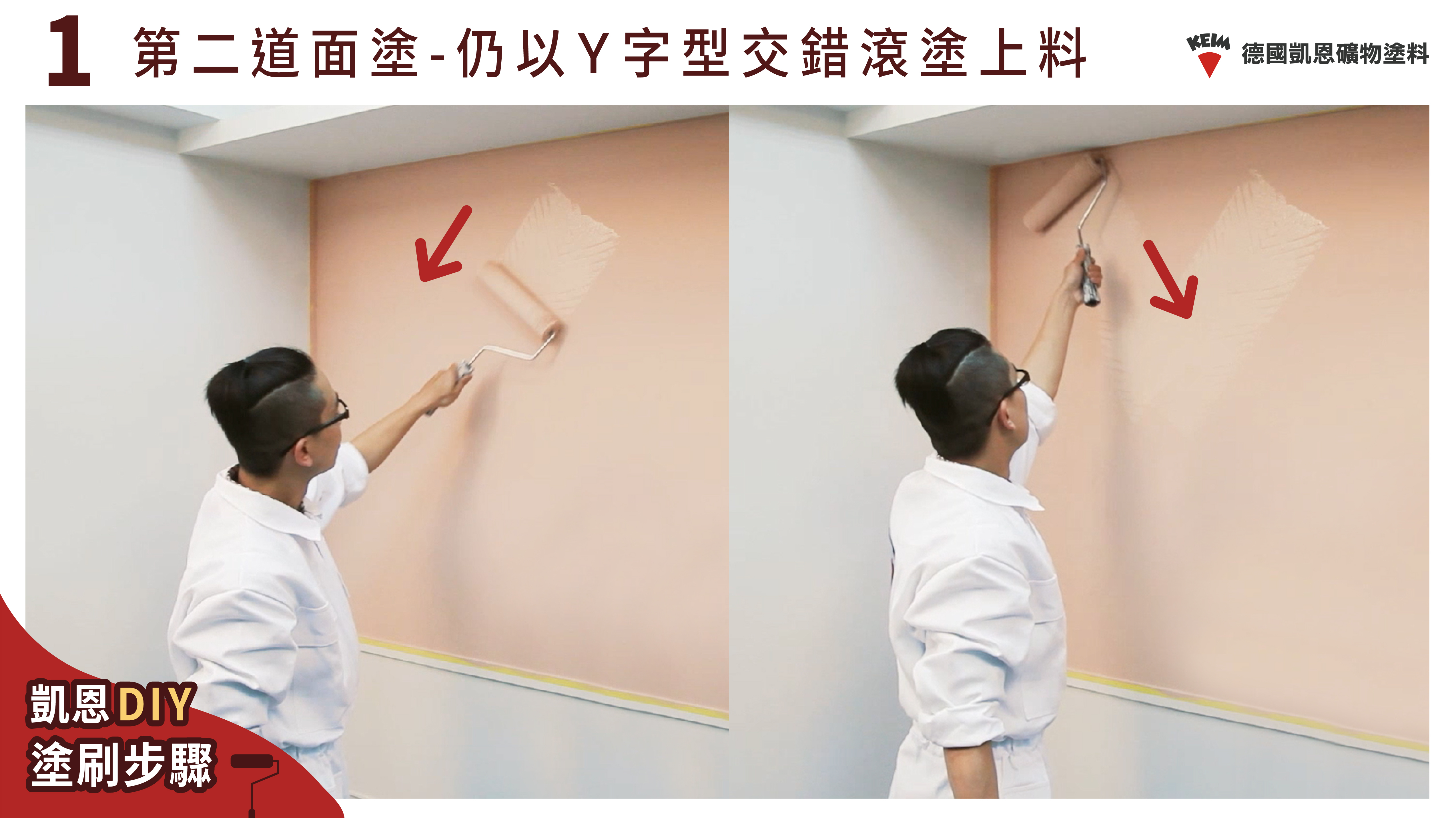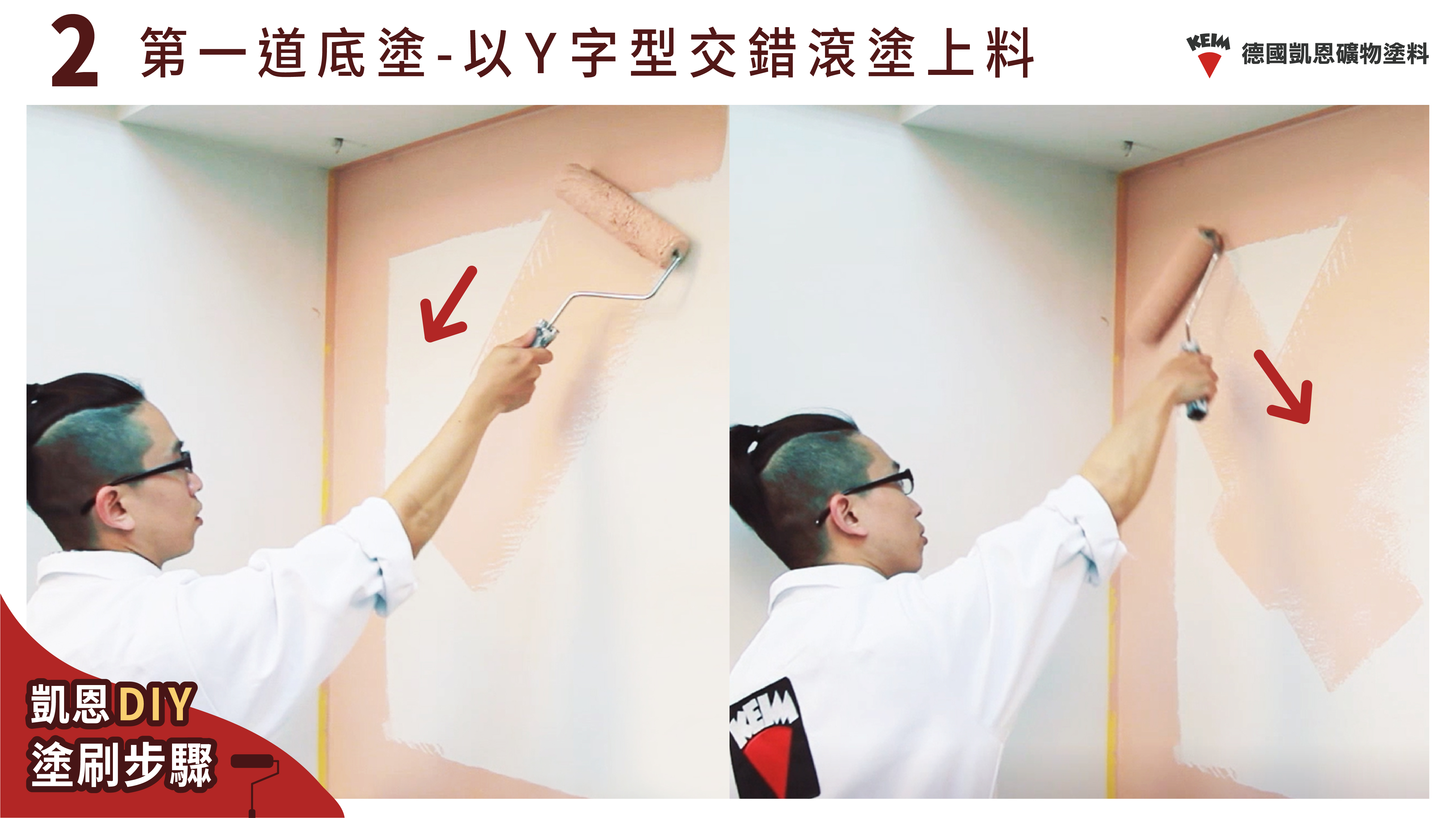 2. 施作時需快速將塗料均勻帶開,若施作者較無經驗,可用「Y 字型」斜向交錯的滾塗方式施作 (如上圖),並以『順向輕收』同方向由上至下順表面紋理輕滾,以免乾濕邊接縫過於明顯。