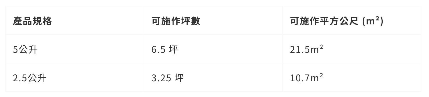 下方為凱恩塗料「施作兩道」的用量參考。若非水泥牆、矽酸鈣板等常見底材,用量會有所不同。