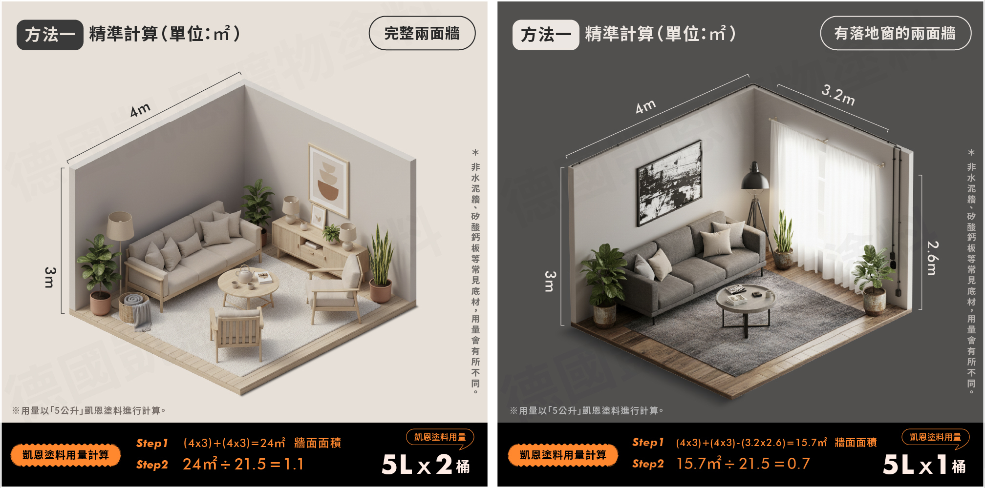 *以 5 公升凱恩塗料(可施作面積 21.5m²)為例進行計算。