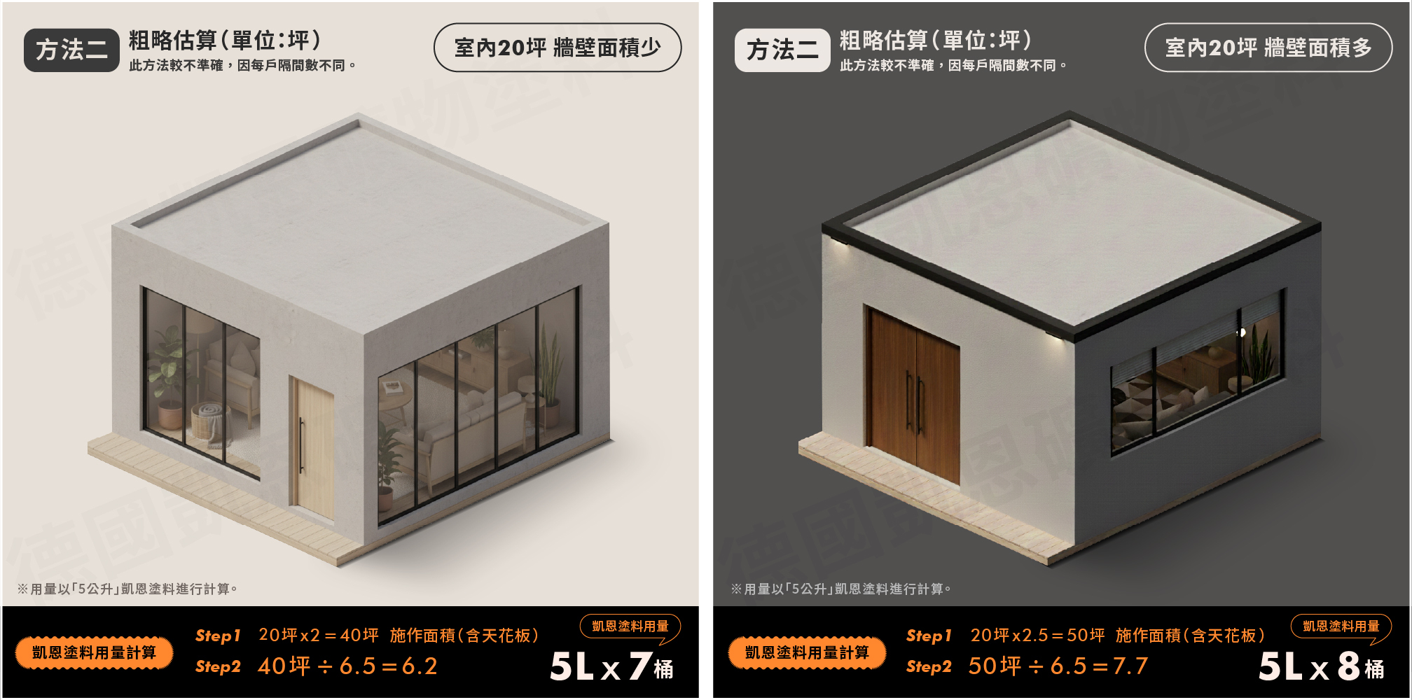*以 5 公升凱恩塗料(可施作坪數 6.5 坪)為例進行計算。